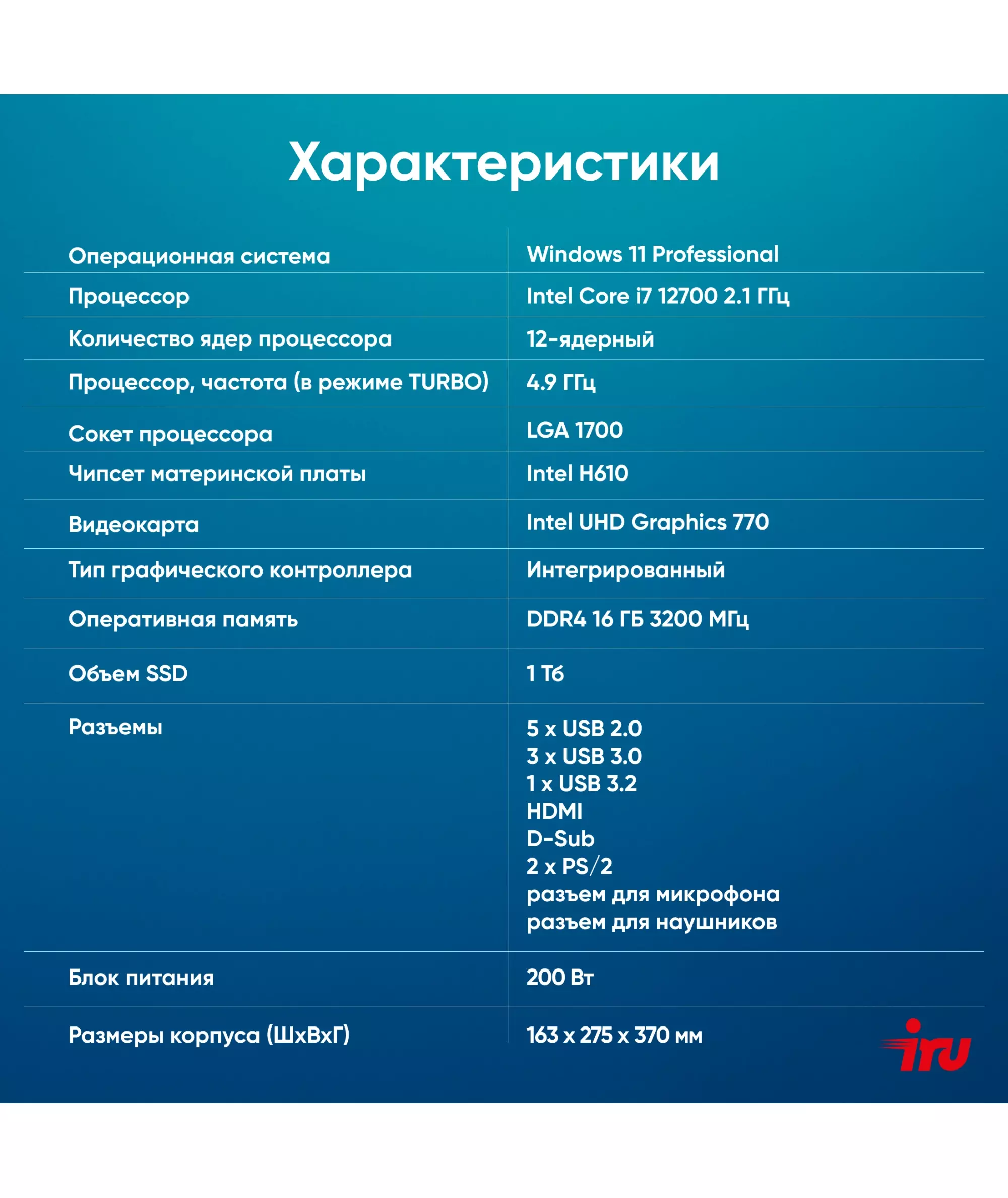 ПК iRU 310SC MT i7 12700 (2.1) 16Gb SSD1Tb UHDG 770 Windows 11 Professional GbitEth 200W черный