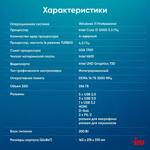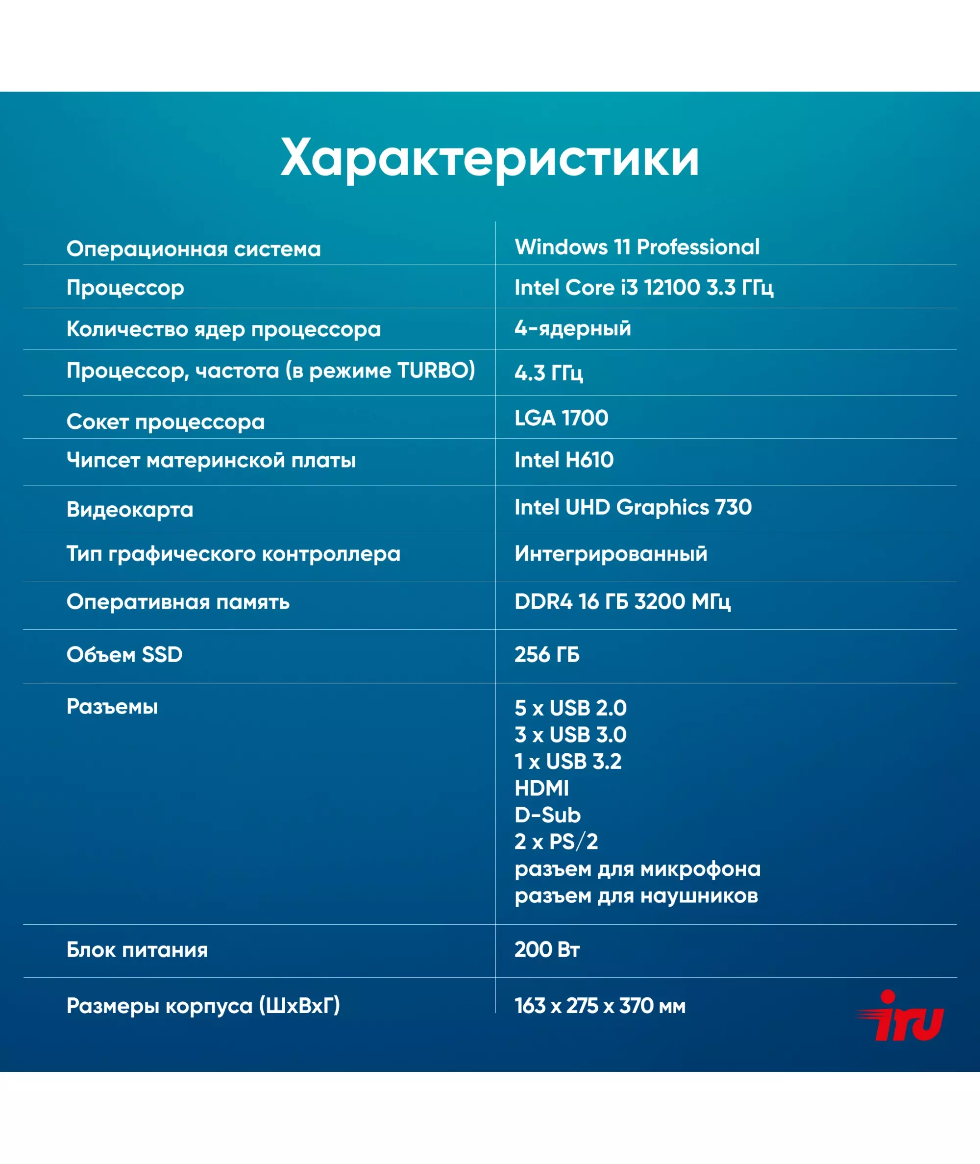 ПК iRU 310SC MT i3 12100 (3.3) 16Gb SSD256Gb UHDG 730 Windows 11 Professional GbitEth 200W черный