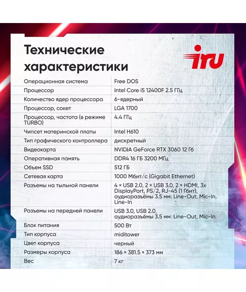 ПК iRU Game 310H6GE MT i5 12400F (2.5) 16Gb SSD512Gb RTX3060 12Gb FreeDOS GbitEth 500W черный [2000612]