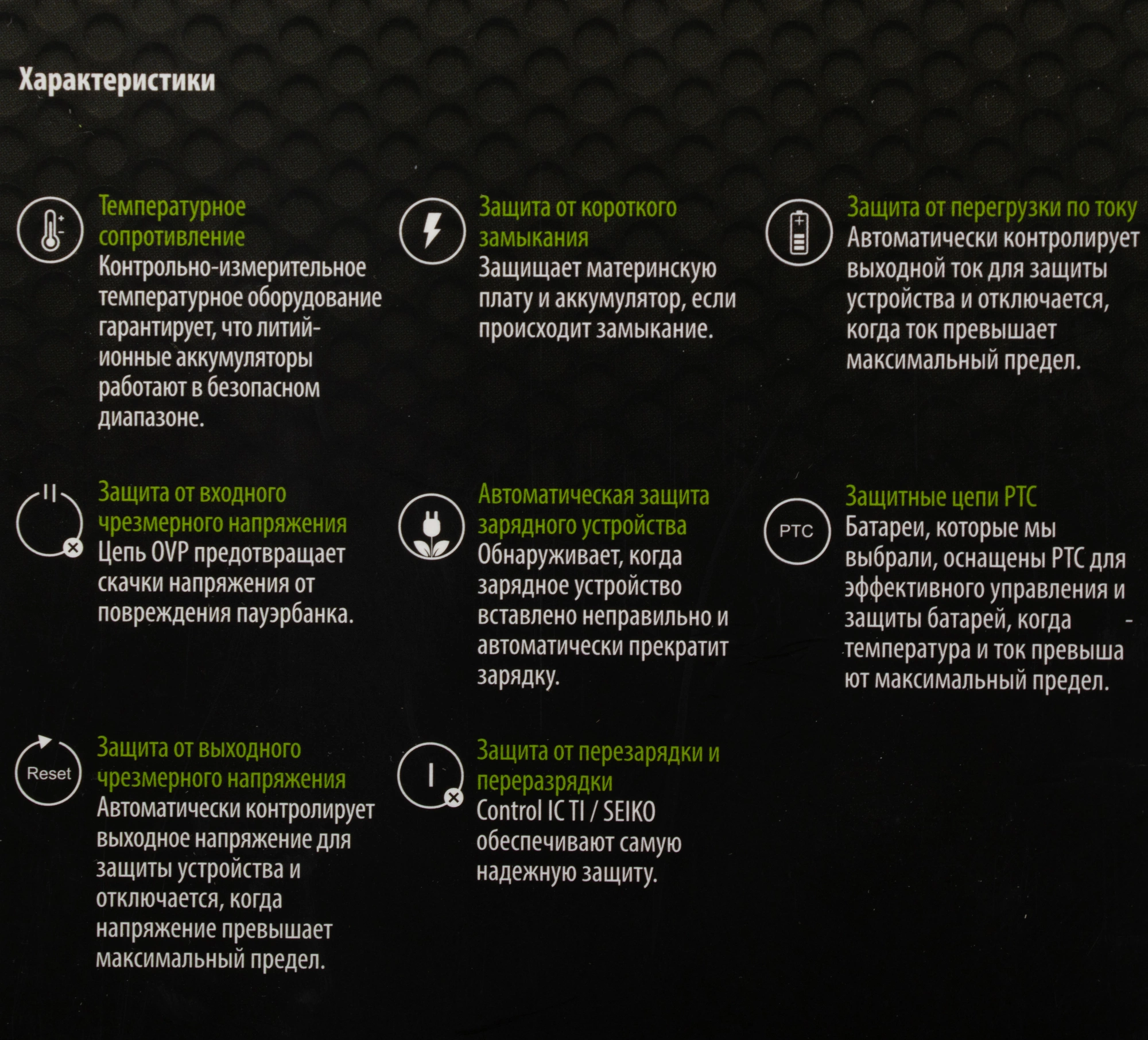 | Защита | от глубокого разряда, от короткого замыкания, от перезаряда |
