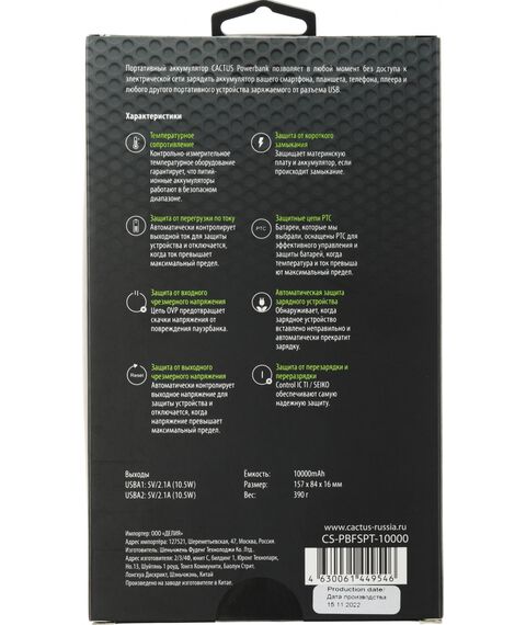 Мобильный аккумулятор Cactus CS-PBFSPT-10000 10000mAh 2.1A 2xUSB-A черный