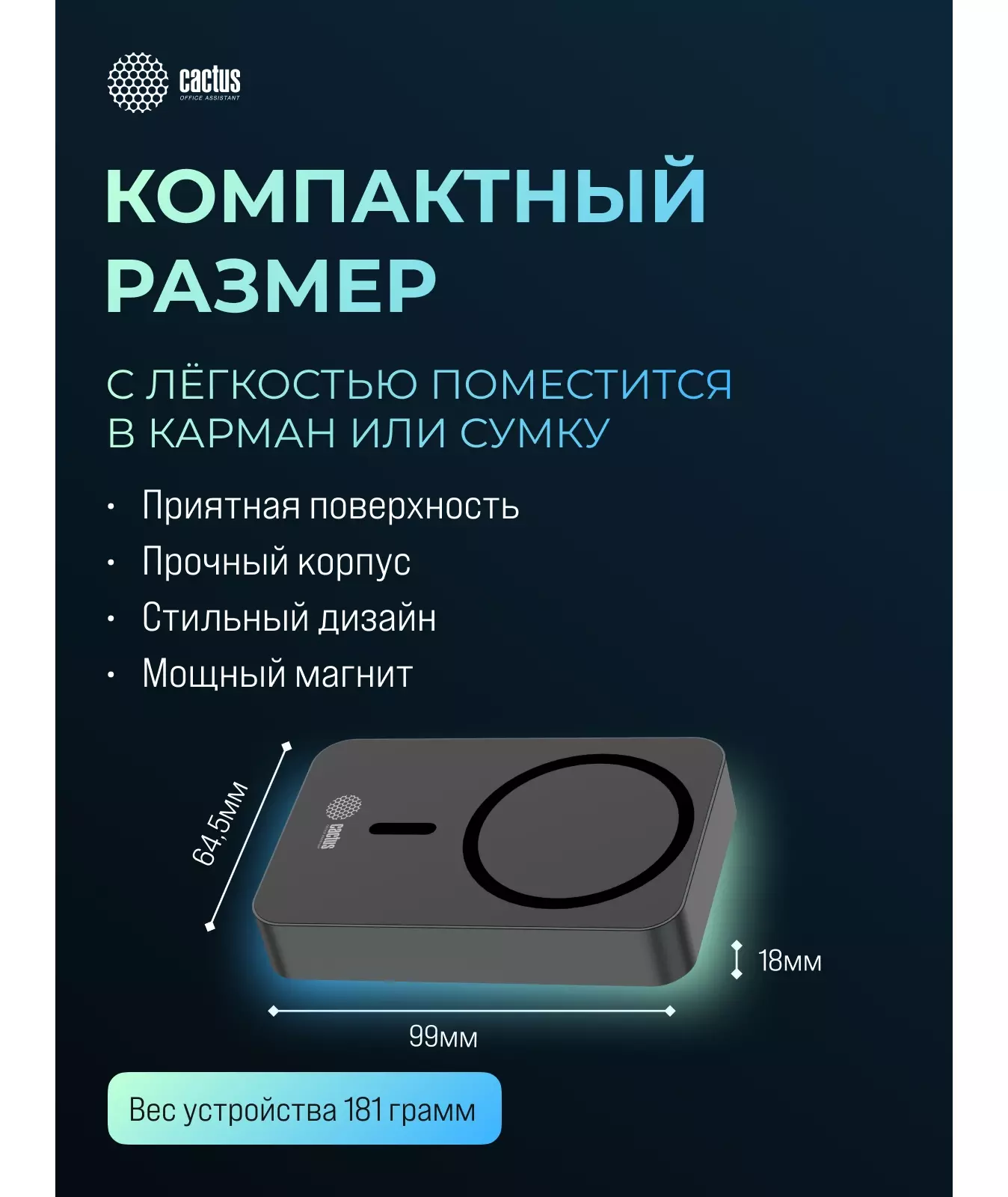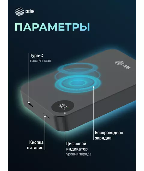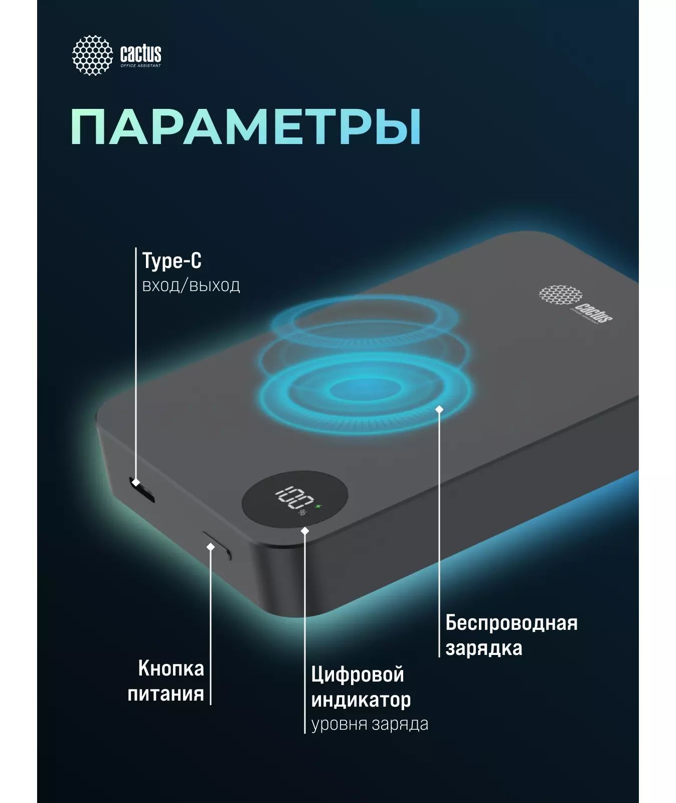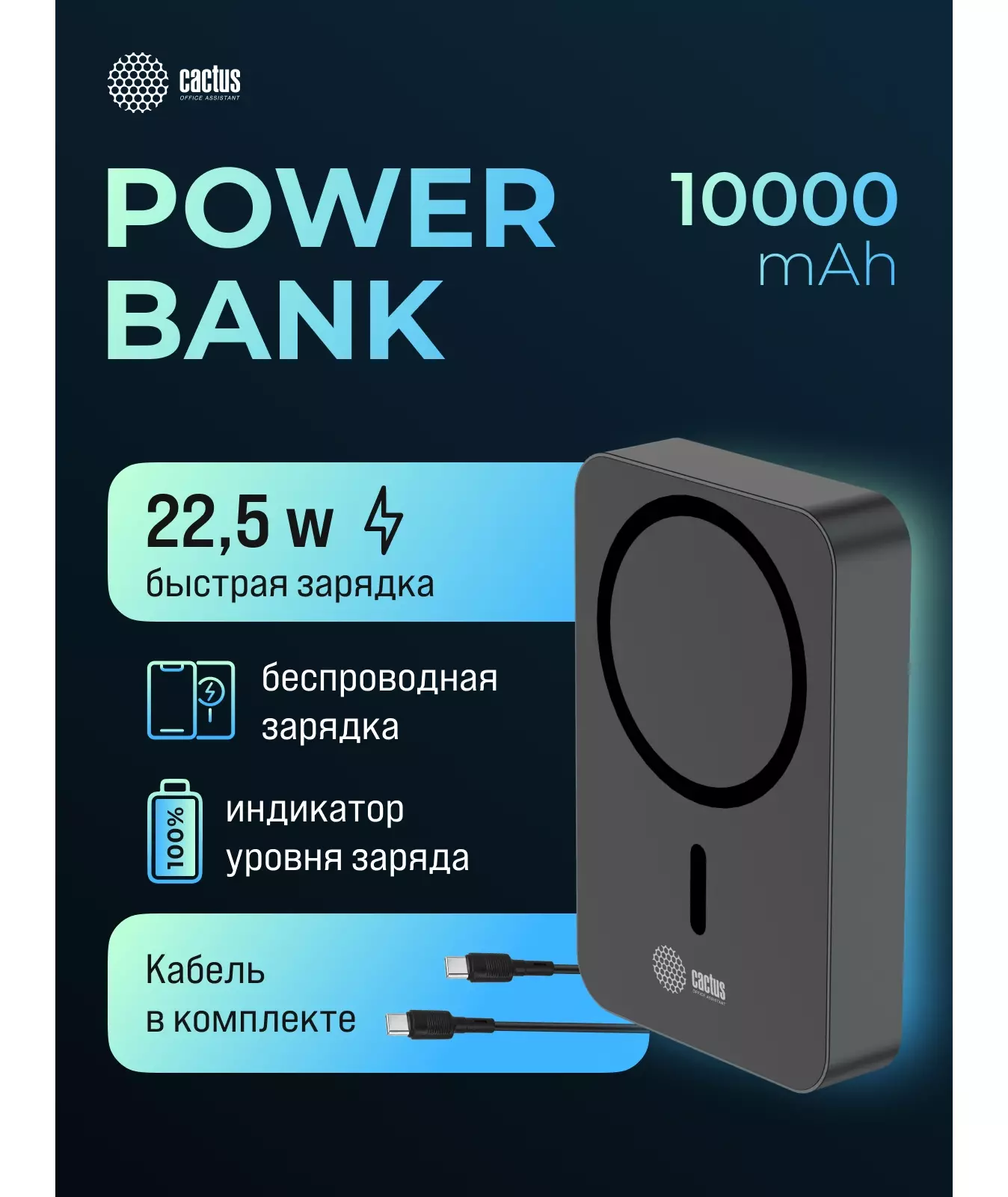 Мобильный аккумулятор Cactus CS-PBFSTA-10000 10000mAh 22.5W 4.5A USB-C беспров.зар. серый