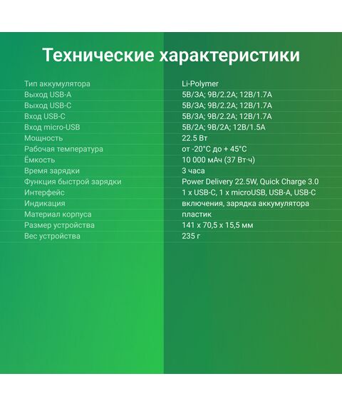 | Выходные разъемы на корпусе | USB-A/USB-C |