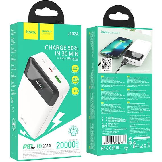 Внешний аккумулятор HOCO J102A Cool Figure 20000mAh, 1xUSB, 1xUSB-C, 3А, QC3.0, PD20W, LED, Li-Pol (белый)