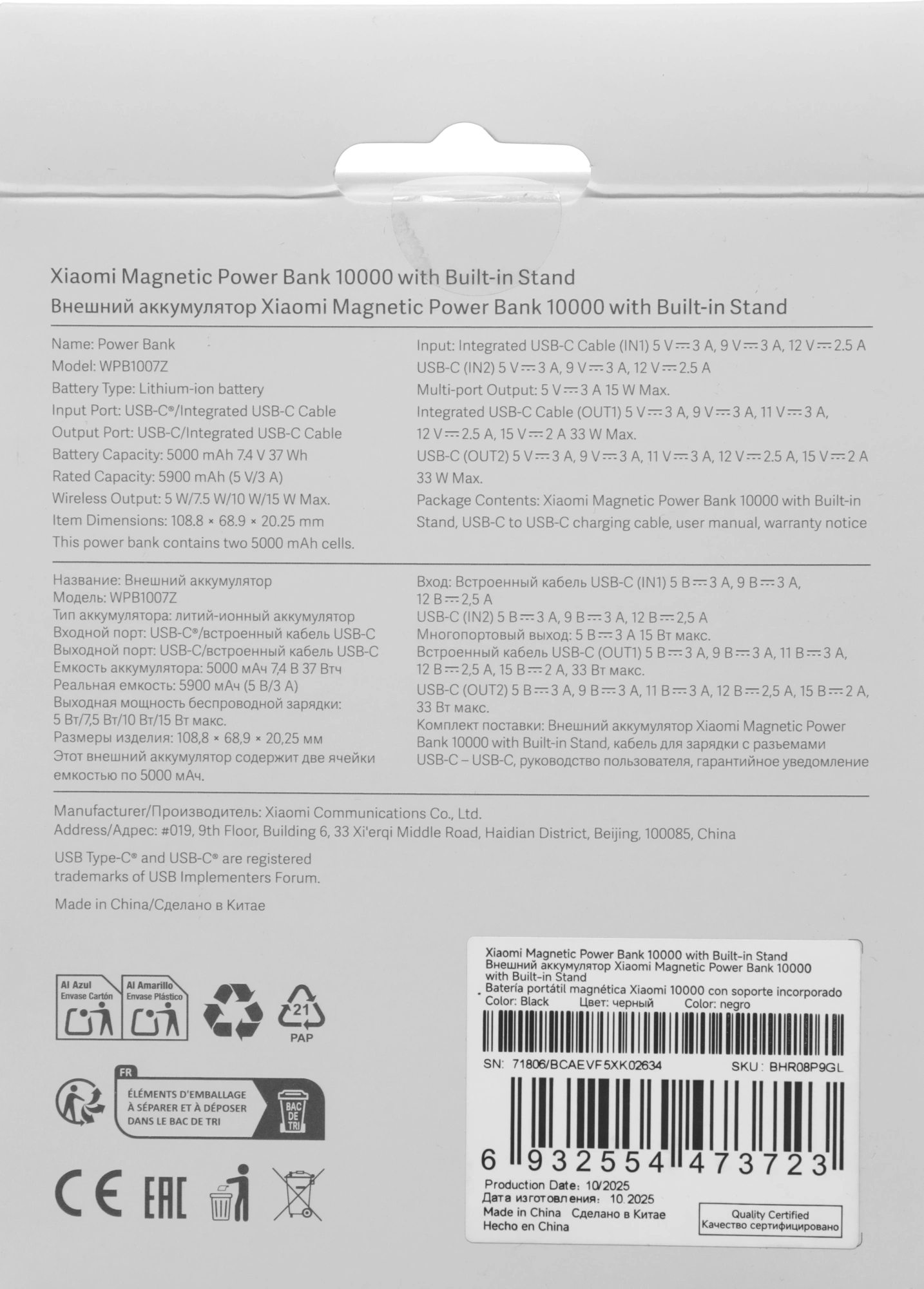 Мобильный аккумулятор Xiaomi BHR08P9GL Magnetic 10000mAh QC3.0/PD3.0 33W 3A USB-C беспров.зар. серый
