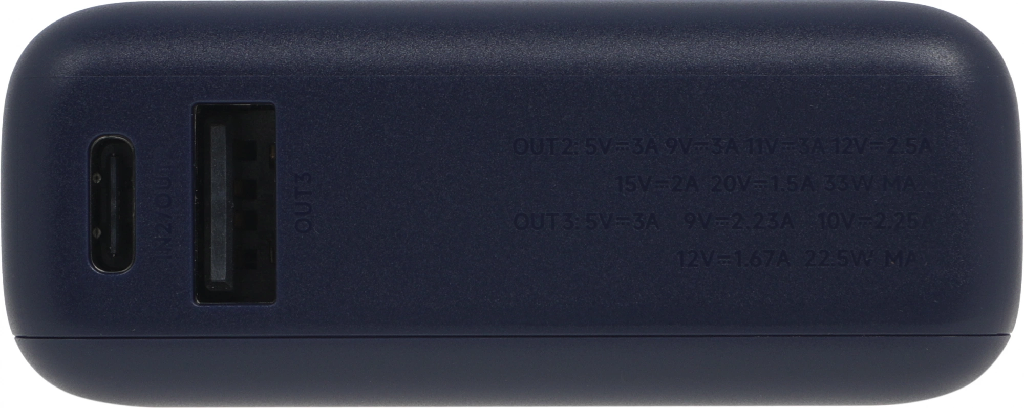 | Режимы напряжения и силы тока | Type-C1: 5В=3А, Type-C1: 9В=3А, Type-C1: 11В=3А, Type-C1: 12В=2.5А, Type-C1: 15В=2А, Type-C1: 20В=1.5А, Type-C2: 5В=3А, Type-C2: 9В=3А, Type-C2: 11В=3А, Type-C2: 12В=2.5А, Type-C2: 15В=2А, Type-C2: 20В=1.5А, USB-A: 5В=3А, USB-A: 9В=2.23А, USB-A: 10В=2.25А, USB-A: 12В=1.67А |