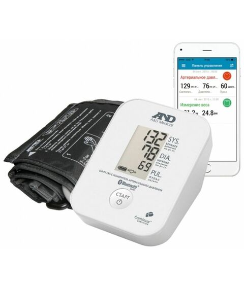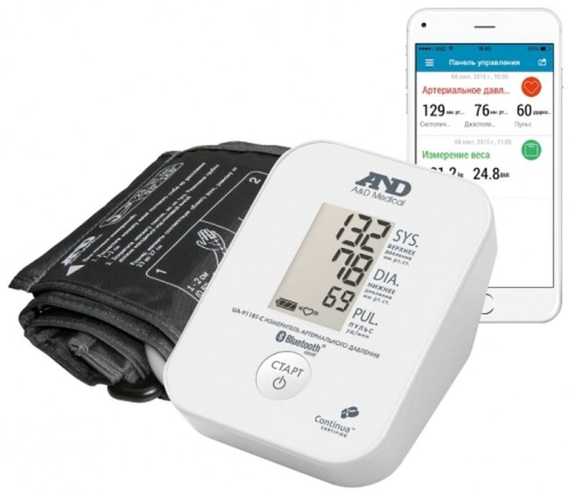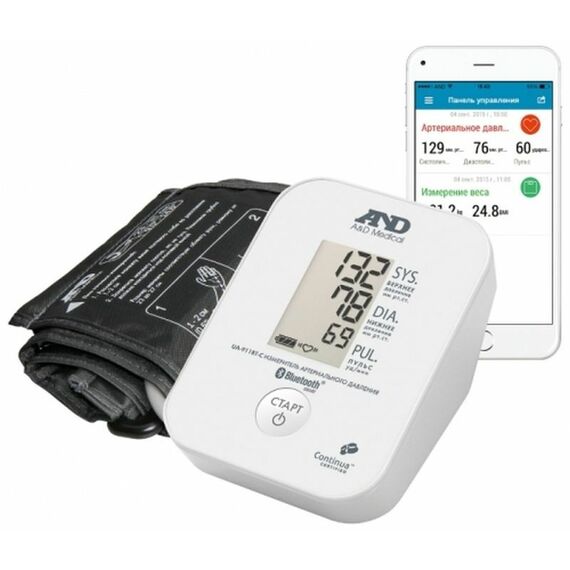 Автоматический тонометр A&D UA-911BT-C с передачей данных по Bluetooth 4.0 в бесплатное мобильное приложение A&D Connect и на сайт с личным кабинетом. Безболезненная манжета 23-37 см. Большой трехстрочный дисплей. Возможность подключения сетевого адаптера. Кейс для хранения.