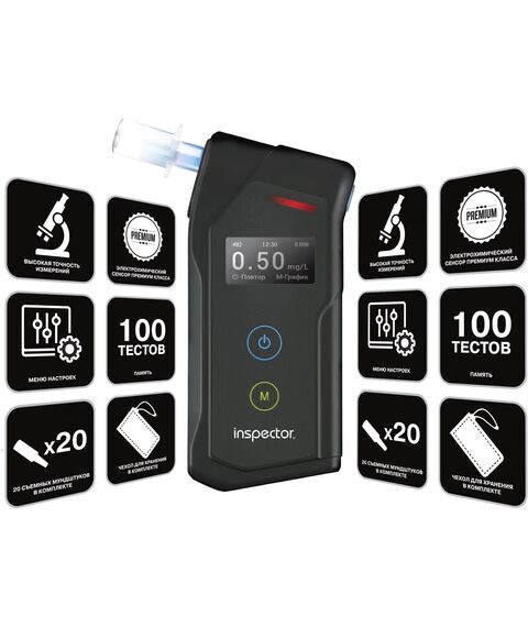 Профессиональный электрохимический алкотестер Inspector AT1100 предназначен для измерения концентрации алкоголя в выдыхаемом человеком воздухе. Прибор разработан как для индивидуального, так и для корпоративного использования, подходит для контроля и проверки большого количества людей