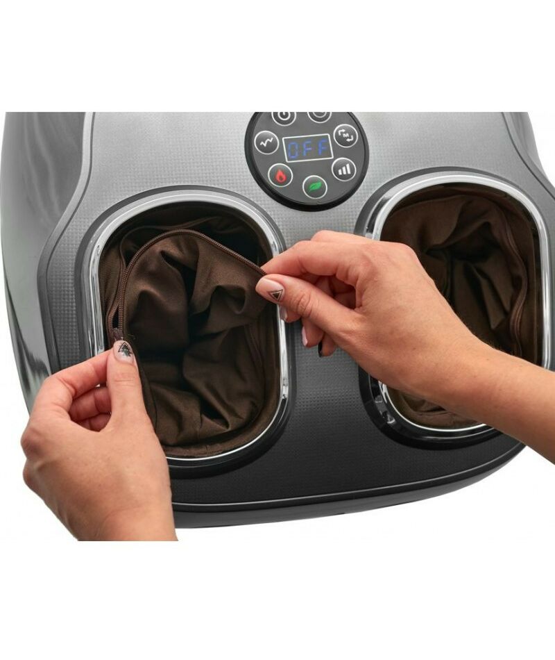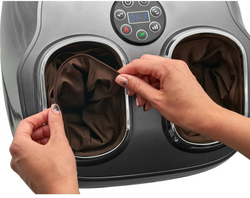 Установите массажер на пол перед креслом или стулом. Сядьте на кресло, положите ступни на массажер. Не становитесь на массажер. Вставьте вилку в розетку, дисплей будет отключен. Кнопка включения: нажмите для начала работы, нажмите еще раз для отключения. Режим по умолчанию: массаж А1, интенсивность компрессии L2, время 20 минут, прогрев H1, роликовый массаж, очищение воздуха и подсветка включены. Постукивающий тайский массаж включен по умолчанию, нажмите еще раз, чтобы отключить. Прогрев: режим по умолчанию H1, режим меняется с H0 до H2. Ионизация воздуха: включено по умолчанию, нажмите, чтобы выключить. Компрессия: L2, регулируйте интенсивность компрессии от L1 (слабая) до L4 (сильная). Начните с L1 и увеличивайте при необходимости. Режим массажа: по умолчанию A1, регулируйте от A1 до A4. Режимы представляют из себя комбинации разминающего, роликового, постукивающего массажа, а также компрессии и прогрева.Попробуйте разные режимы для настройки массажера под себя. Таймер: длительность массажа по умолчанию 20 минут, регулируйте время массажа от 5 до 30 минут. Каждое нажатие кнопки добавляет 5 минут. Когда массаж окончен, дисплей отключится, можно вынуть вилку из розетки.