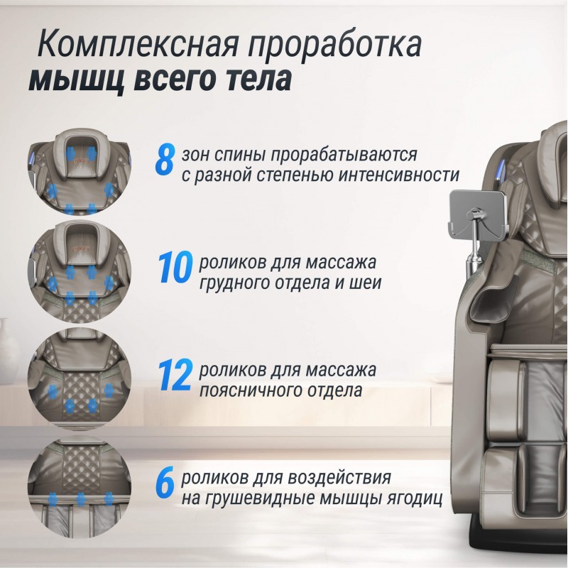 | Количество массажных роликов | 8 в зоне спины + 22 для поясницы + 6 для ягодиц + 24 для стоп |