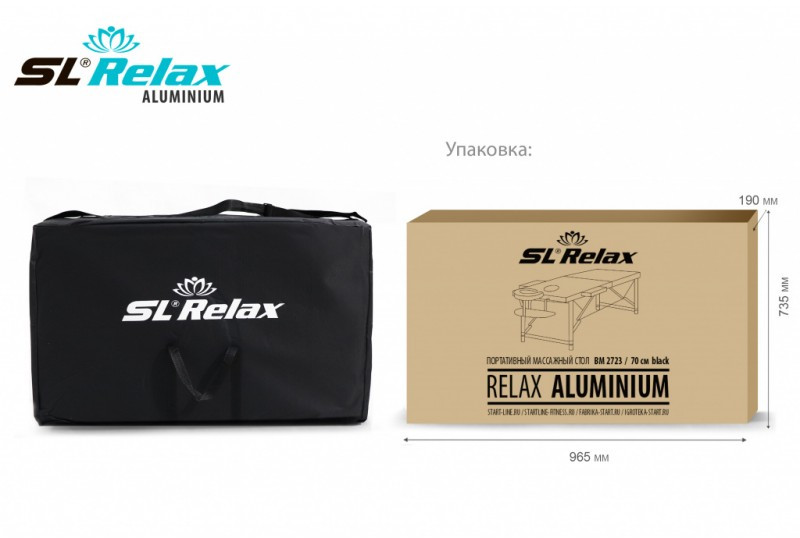 - Портативный складной массажный стол Aluminium BM2723-1 бренда SL Relax– оборудование, которое позволит выполнять услуги на высоком уровне и подойдет для любого вида массажа. Благодаря компактным размерам стол легко поместится в помещение с небольшой площадью.