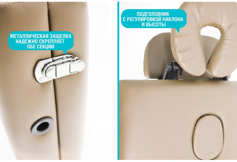 - Продуманная конструкция модели обеспечит максимальный комфорт клиенту во время массажа спины, шеи и ног. В спинке есть удобное анатомическое отверстие для лица, подголовник с регулировкой наклона и высоты.Для удобства рук предусмотрены мягкие подлокотники.