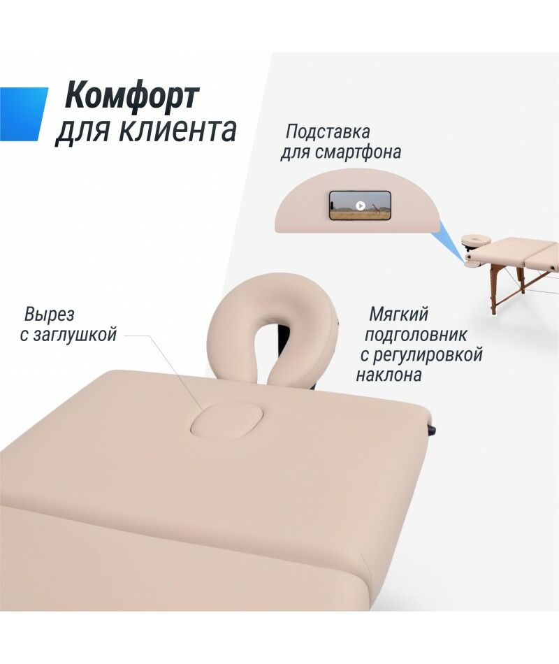 Одним из ключевых преимуществ стола является возможность точной настройки положения каждого элемента. Возможность изменения угла наклона и высоты подголовника позволяет обеспечить комфортное положение головы и шеи клиента. Спинка настраивается для поддержки клиента в разных положениях, включая сидячее и лежачее. Секция в изголовье регулируется от 0 до 40 градусов, а ножная часть может подниматься на 30 градусов, улучшая доступ к клиенту и помогая мастеру эффективно массировать тело, руки, ноги и стопы. Эти функции делают стол удобным как для мастера, так и для клиента, позволяя создавать индивидуальные условия для каждого сеанса.