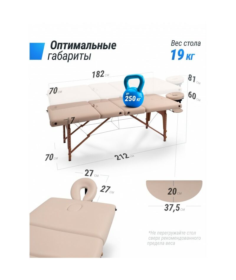 Деревянная кушетка для массажа выделяется невероятно прочной конструкцией, способной выдержать общую нагрузку до 250 кг (не перегружайте стол сверх рекомендованного предела веса). Благодаря своим компактным размерам 182 х 69 см, она идеально впишется даже в самые небольшие помещения, будь то СПА-салон, домашний кабинет или офис. Возможность ручной регулировки высоты ножек от 60 до 81 см с шагом 3 см позволяет адаптировать стол под рост массажиста, обеспечивая наилучшую результативность сеансов массажа. Ложе толщиной 7 см обеспечит дополнительную поддержку и комфорт. Для еще большего удобства массажного стола в комплекте предусмотрены регулируемый по наклону и высоте подголовник и подставка для гаджетов, расположенная у изголовья, а также боковые подлокотники.
