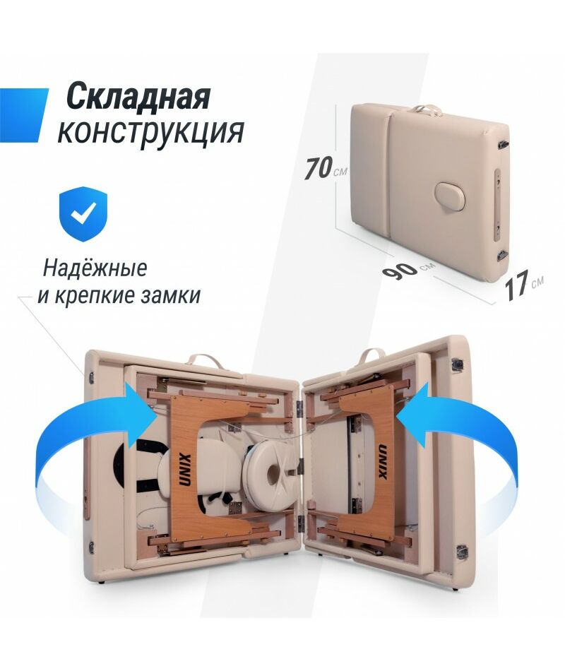 Складная кушетка обшита высококачественной экокожей, которая обладает влагонепроницаемыми свойствами. Такая обивка идеально подходит для использования масел и кремов, ведь она не впитывает жидкости и легко очищается. Эластичный наполнитель поролон обеспечивает мягкую поддержку телу, создавая ощущение комфорта и расслабления. Регулируемый валик и подголовник помогают правильно распределять давление на шею и голову, предотвращая дискомфорт и усталость. Подголовник поддерживает голову в нужном положении, минимизируя напряжение мышц шеи. Эти особенности обеспечивают глубокий уровень релаксации и комфорта, повышая эффективность любой массажной или косметологической процедуры.