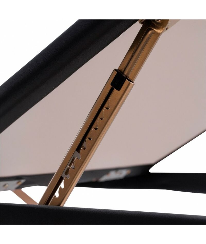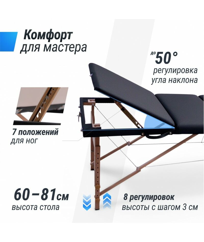 Подголовник обладает возможностью регулировки по высоте и наклону, обеспечивая идеальную поддержку головы и шеи. Ножная часть стола поднимается на 50 градусов (7 позиций), что позволяет клиентам занять самое удобное положение для проведения процедуры. Складной стол оборудован удобными подлокотниками 34х10 см, подвесной полкой для гаджетов 37,5х20 см и лямками с застежками-липучками.