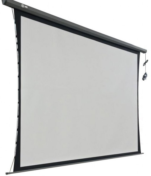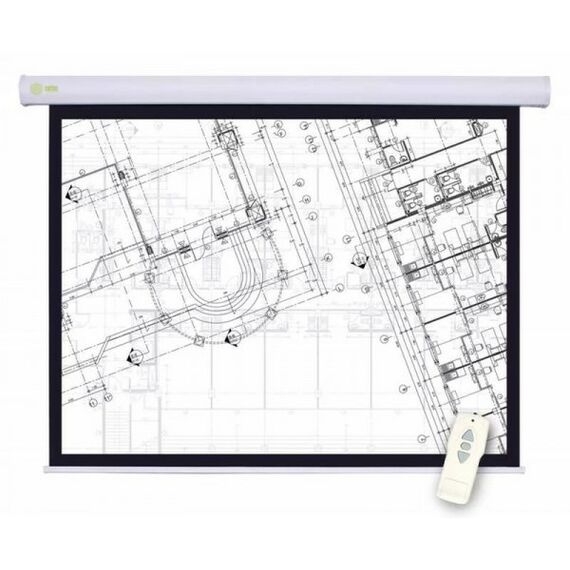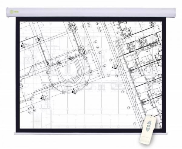 Экран с электроприводом и пультом дистанционного управления, угол обзора 100°, формат 1:1, рабочая температура от -20 до +40°C.