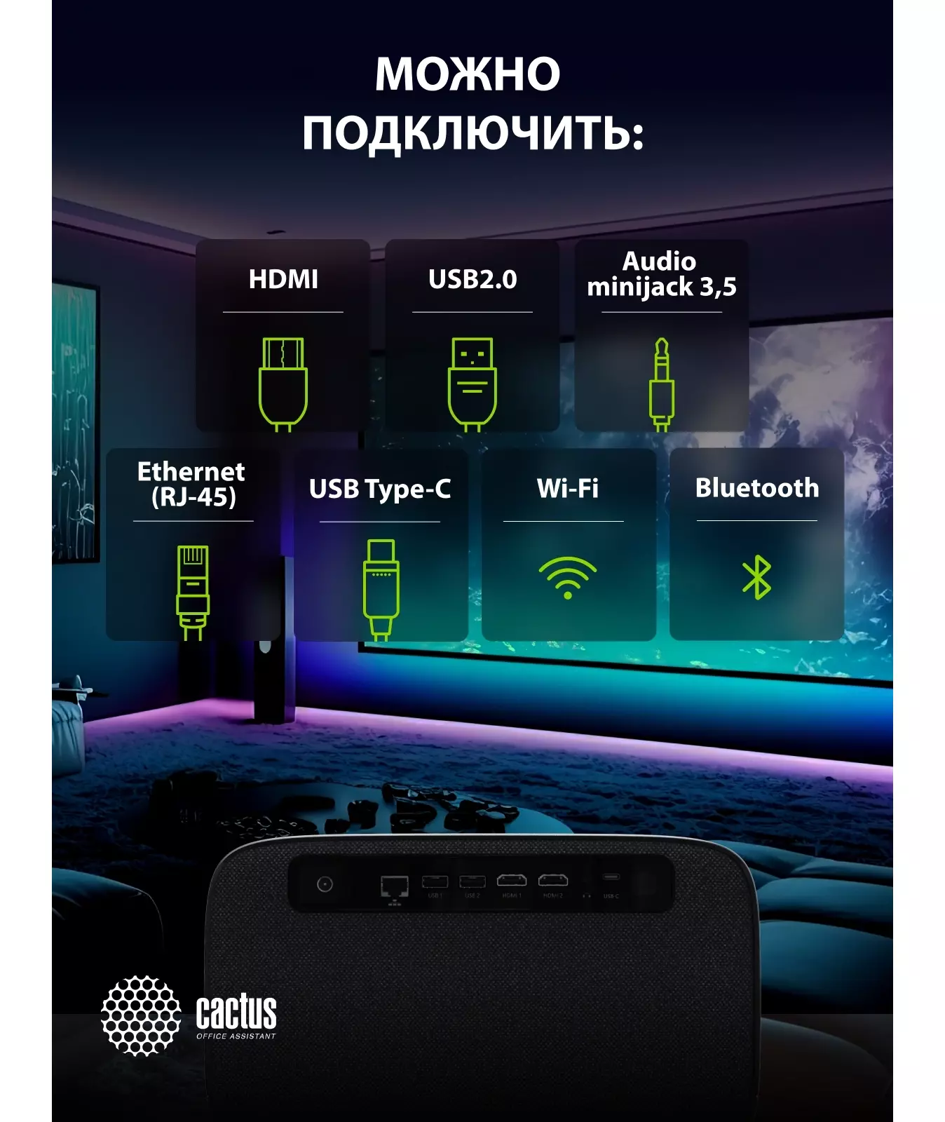 | Возможность по установке | Фронтальная проекция, Обратная проекция, Крепление к потолку |