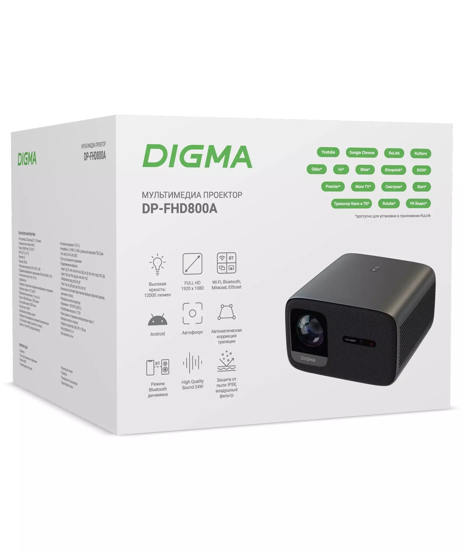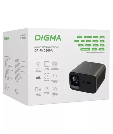 | Комплектация | Проектор Digma DP-FHD800A, Пульт ДУ, Крышка объектива, Кабель HDMI, Сетевой адаптер питания, Салфетка, Руководство пользователя, Гарантийный талон |