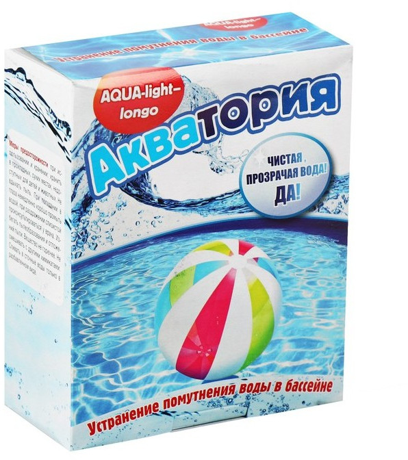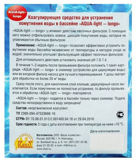 «Акватория AQUA-light-longo» усиливает действие песочных фильтров, с его помощью можно отфильтровать взвеси, дающие помутнение воды, которые не улавливаются обычным фильтром. Описание продукта: медленно растворимый, заранее порционированный коагулятор хлопьев (взвесей) в виде таблеток в водопроницаемых картриджах из ткани.