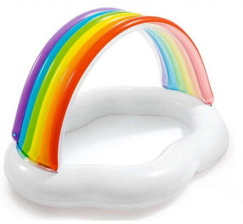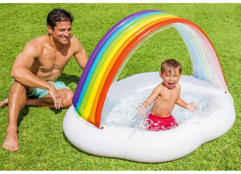 - Детский надувной бассейн Радужное облачко с навесом подарит живительную прохладу и защитит от яркого солнышка Вашего малыша! Ребенок будет в восторге от его жизнерадостного дизайна, а родители оценят высокий уровень безопасности. Тент-радуга отлично предохраняет ребенка от воздействия прямых солнечных лучей. Низкие бортики бассейна не дадут малышу упасть. Изготовлен из прочного винила толщиной 0,25 мм