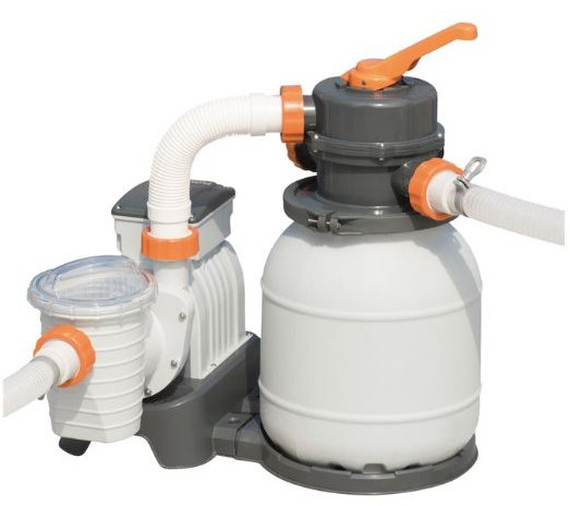 - В комплете имеется песочный фильтр-насос производительностью 3785 л/ч, лестница, тент и подстилка