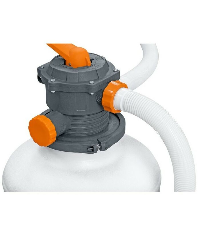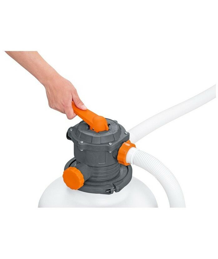 Песочный фильтр-насос подключается к бассейну двумя гофрированными шлангами, и обеспечивает циркуляцию и очистку от внешних загрязнителей. Имеется 6 режимов работы с обратной промывкой, а также манометр и таймер. С крупным мусором поможет справиться установленный скиммер. Производит очистку воды лучше чем картриджный фильтр-насос.