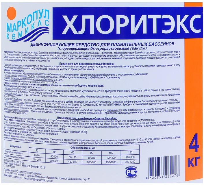 Хлоритэкс – хлорсодержащее дезинфицирующее средство для бассейнов в форме быстрорастворимых гранул.