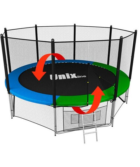 - Помимо верхней защитной сетки, все батуты модельного ряда UNIX line оборудованы нижней защитной сеткой, которая препятствует проникновению под прыжковое полотно батута детей, животных, а так же попаданию посторонних предметов, и лестницей для удобства пользования. А в моделях диаметром от 10FT (305см.), в комплект входят специальные крепления батута к земле (колышки).