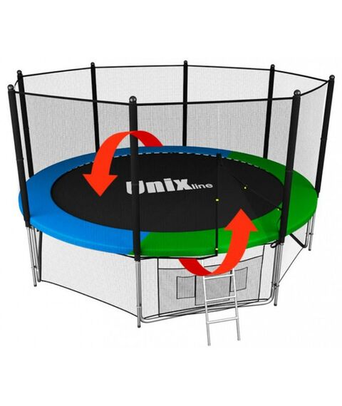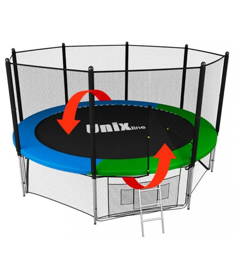 - Помимо верхней защитной сетки, все батуты модельного ряда UNIX line оборудованы нижней защитной сеткой, которая препятствует проникновению под прыжковое полотно батута детей, животных, а так же попаданию посторонних предметов, и лестницей для удобства пользования. А в моделях диаметром от 10FT (305см.), в комплект входят специальные крепления батута к земле (колышки).