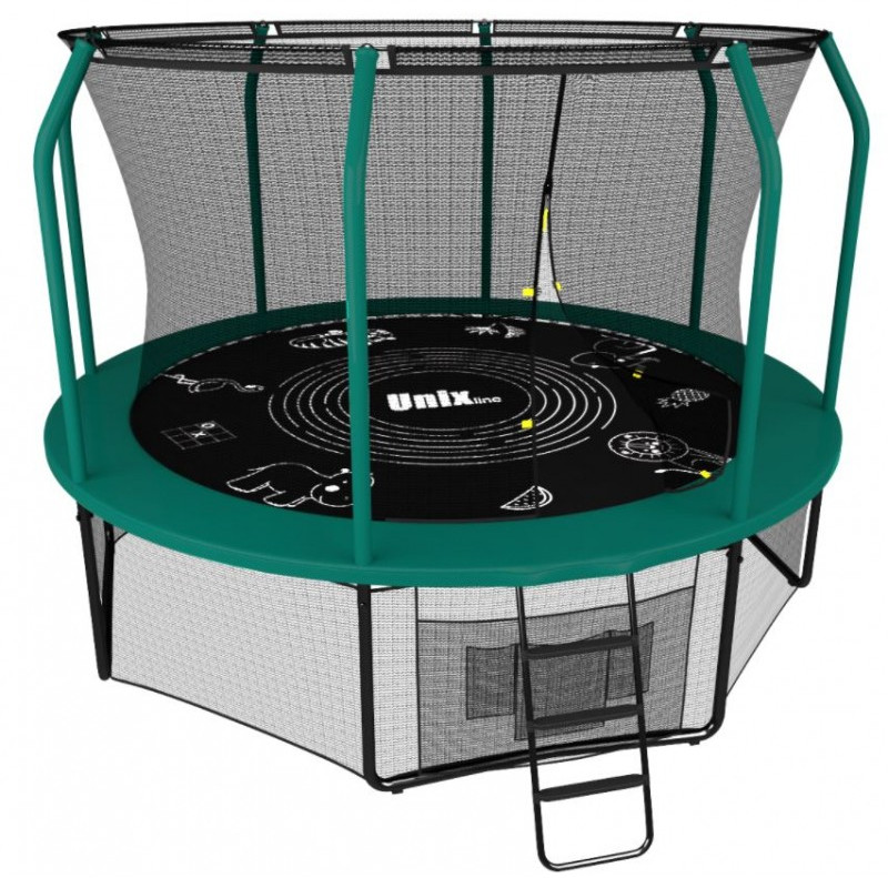 - Помимо верхней защитной сетки, все батуты премиального модельного ряда UNIX line оборудованы нижней защитной сеткой, которая препятствует проникновению под прыжковое полотно батута детей, животных, а также попаданию посторонних предметов, и лестницей для удобства пользования. Так же в комплект входят специальные крепления батута к земле (колышки).