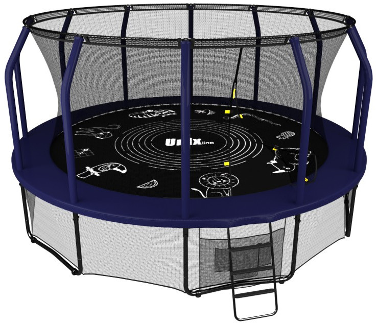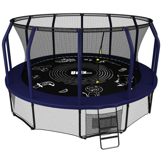 - Помимо верхней защитной сетки, все батуты премиального модельного ряда UNIX line оборудованы нижней защитной сеткой, которая препятствует проникновению под прыжковое полотно батута детей, животных, а также попаданию посторонних предметов, и лестницей для удобства пользования. Так же в комплект входят специальные крепления батута к земле (колышки).