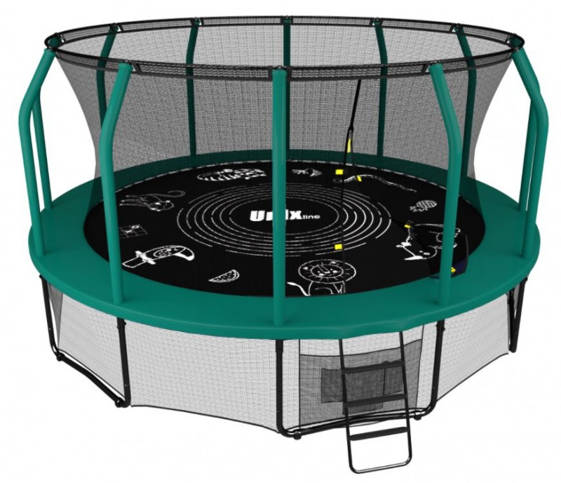 - Помимо верхней защитной сетки, все батуты премиального модельного ряда UNIX line оборудованы нижней защитной сеткой, которая препятствует проникновению под прыжковое полотно батута детей, животных, а также попаданию посторонних предметов, и лестницей для удобства пользования. Так же в комплект входят специальные крепления батута к земле (колышки).