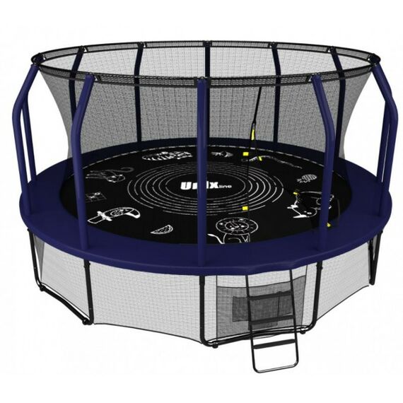 - Помимо верхней защитной сетки, все батуты премиального модельного ряда UNIX line оборудованы нижней защитной сеткой, которая препятствует проникновению под прыжковое полотно батута детей, животных, а также попаданию посторонних предметов, и лестницей для удобства пользования. Так же в комплект входят специальные крепления батута к земле (колышки).