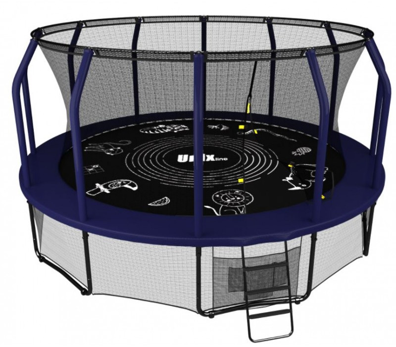- Помимо верхней защитной сетки, все батуты премиального модельного ряда UNIX line оборудованы нижней защитной сеткой, которая препятствует проникновению под прыжковое полотно батута детей, животных, а также попаданию посторонних предметов, и лестницей для удобства пользования. Так же в комплект входят специальные крепления батута к земле (колышки).