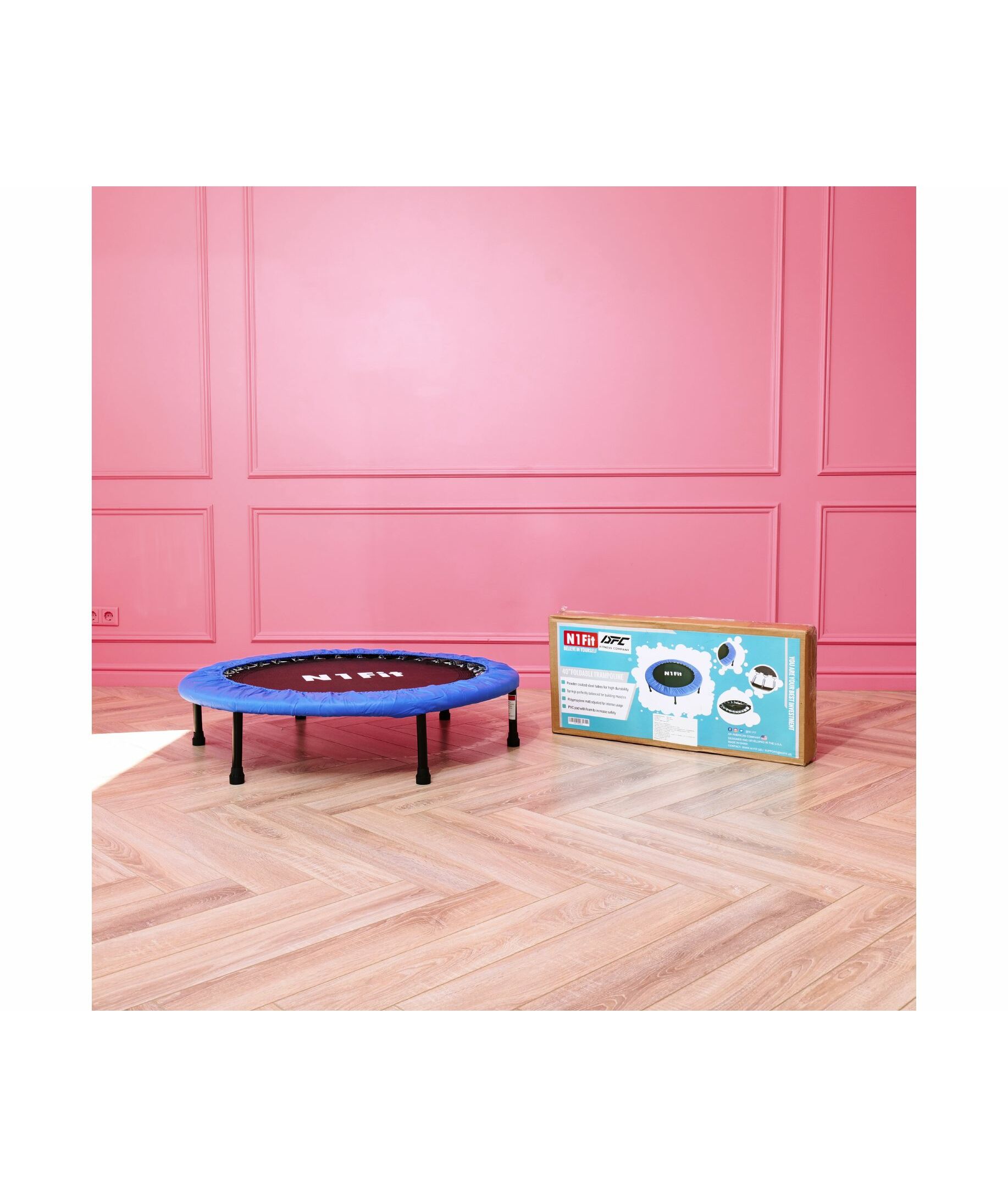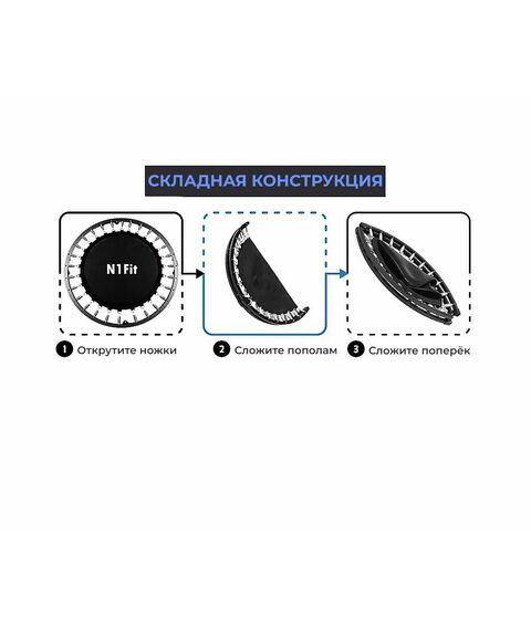 Складной батут DFC N1Fit без сетки разработан с учётом безопасности и комфорта пользователей. Максимальный вес, который он может выдержать, составляет 100 кг, а диаметр этой модели — 40 дюймов (102 см).
