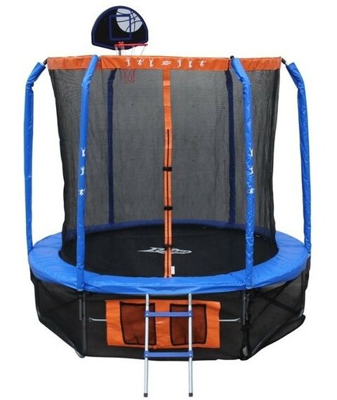 Диаметр батута: 305 см Высота сетки: 170 см (общая высота от пола 246 см) В комплект входят: батут, мягкое рамное покрытие, лесенка, баскетбольный щит, баскетбольное кольцо (арт. 010377) защитная сетка (арт. 010378) полиэстер Максимальная нагрузка на батут: 150 кг.