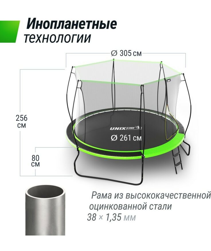 Каркасный батут UNIX Line UFO 10 ft с защитной сеткой - идеальное сочетание безопасности, надежности и веселья, что делает его отличным выбором отдыха и развлечения детей и взрослых! Главное преимущество серии батутов UFO – устойчивость – благодаря широким изогнутым ножкам, которые выходят за диаметр батута, конструкция получается максимально устойчивой и неподвижной даже во время самых активных игр.