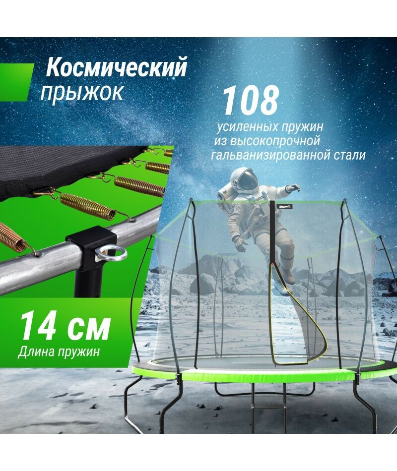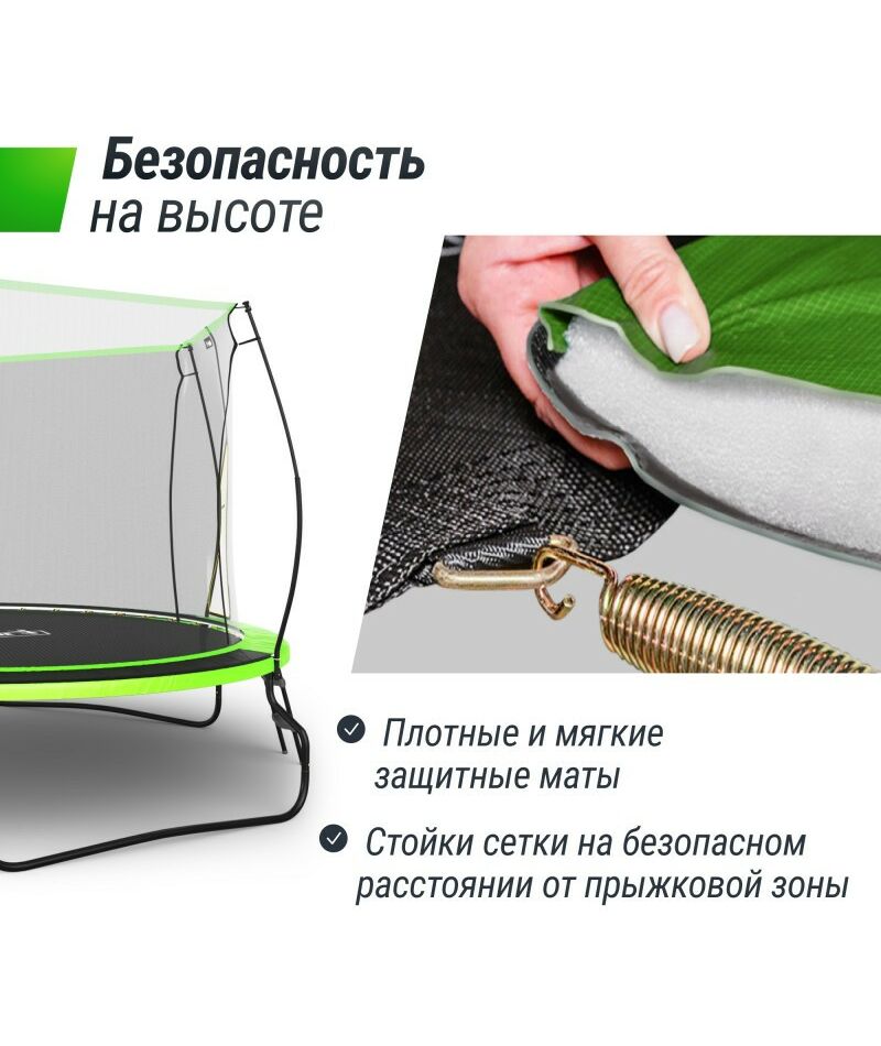 60 пружин, скрытых под накладкой, обеспечивают оптимальное натяжение полотна и отличный отскок! Широкое прыжковое полотно 305 см производится из специального высокопрочного материала Permatron, устойчивого к любым неблагоприятным воздействиям окружающей среды и механическим воздействиям. Permatron – эластичный материал, легко возвращающийся в исходное состояние при постоянном воздействии с разной нагрузкой. Он устойчив к внешним воздействиям: ультрафиолету, плесени, влаге, резким изменениям температуры. Термическая обработка делает эту ткань устойчивой к постоянным изгибам и стрессовым нагрузкам. Подходит для применения дома и на улице, этот материал не боится осадков и воздействия солнечных лучей, также обладает антисептическими свойствами. Максимально допустимый вес пользователя 150 кг. Размер прыжковой зоны: 261 см. Высота ножек: 76 см. Высота всего батута: 256 см.