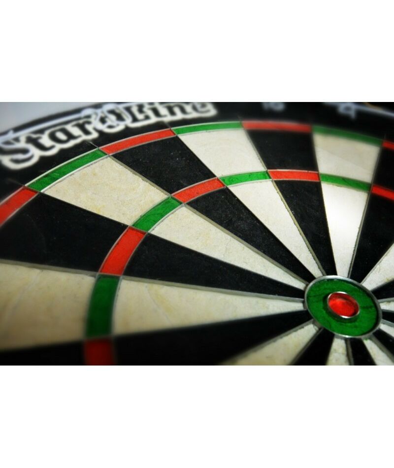 Материал мишени – кенийское сизалевое волокно. Острый нож границы секторов, вращающееся кольцо нумерации. Комплект включает собранные дротики с латунным покрытием высокого качества 6 шт x 18 гр (3 дротика с синим хвостовым оперением и 3 с зеленым хвостовым оперением), а также крепление для подвешивания к стене.