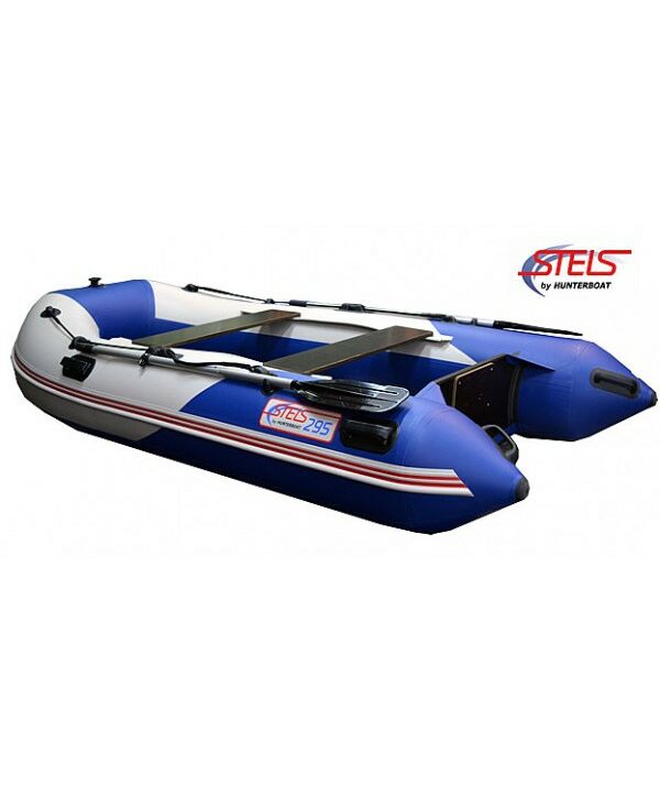 Надувная лодка СТЕЛС 295 изготовлена и ПВХ ткани плотностью 950 гр/м.кв., и представлена в современном дизайне и комбинированном сине/белом цвете.