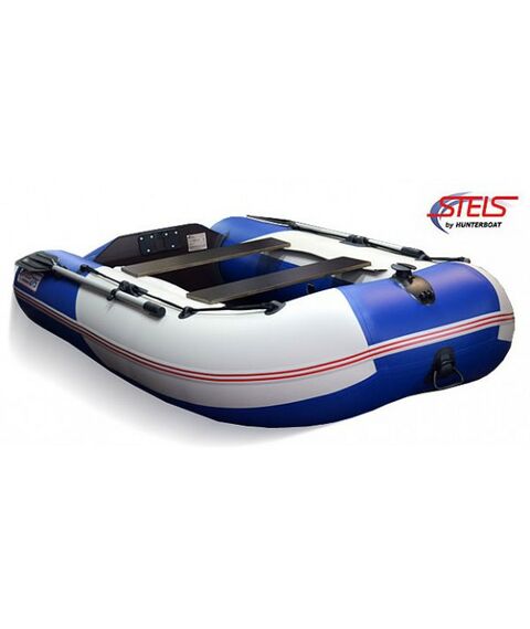 Надувная лодка СТЕЛС 275 изготовлена и ПВХ ткани плотностью 750 гр/м.кв., и представлена в современном дизайне и комбинированном сине/белом цвете.