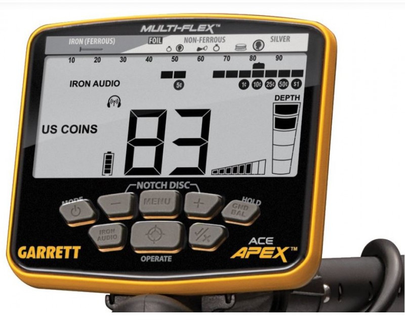 - Garrett ACE Apex - это первый металлоискатель Garrett c мультичастотностью, технологию назвали «Multi-Flex Technology», прибор работает как в этом режиме, так и на выбранном пользователем частотном режиме, наиболее продуктивном для тех или иных задач и условий поиска. Это 5, 10, 15 или 20 кГц, плюс мультичастотных режима Multi-Flex для обычного поля и Multi-Salt для поиска на морском пляже или в морской воде