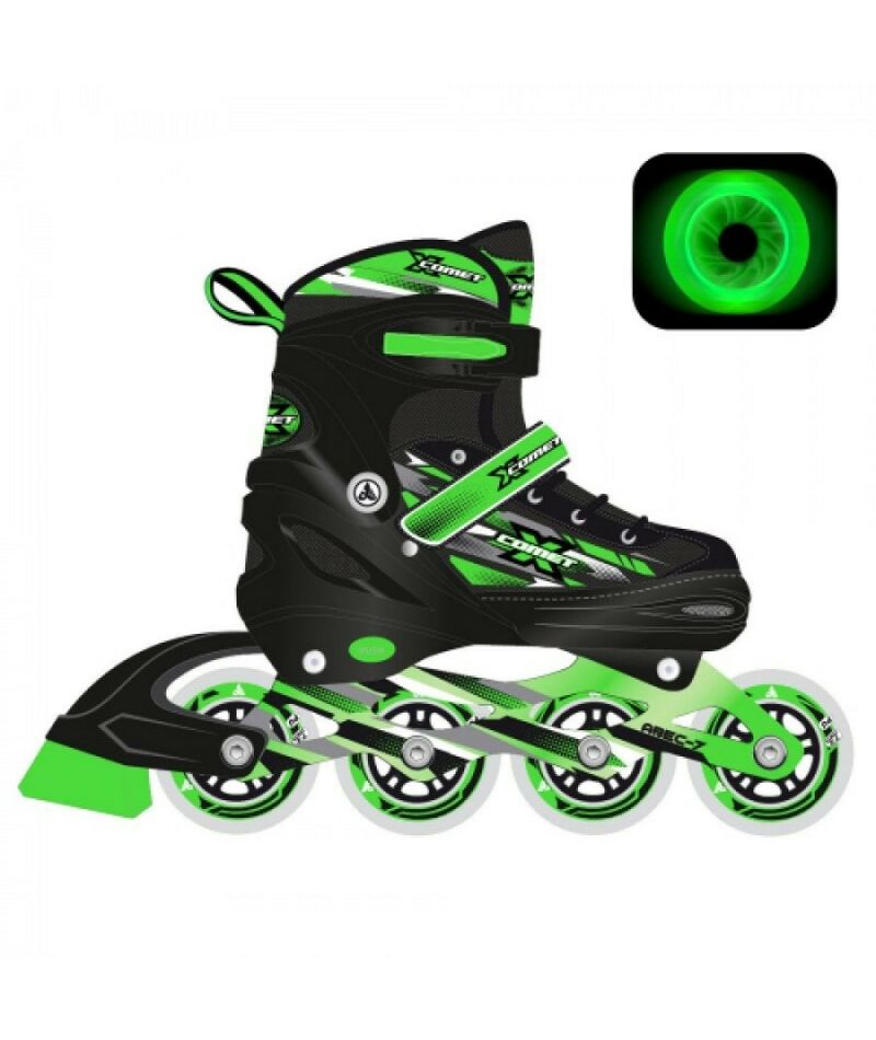 Коньки роликовые "Альфа Каприз" Fantom Green - современная и отличная модель роликов. Огромный плюс этой модели в том, что она имеет в своей комплектации раздвижной механизм длины на четыре размера, который позволит не беспокоится, что Ваши ролики станут малы на следующий сезон. Комфортный полумягкий ботинок изготовлен из качественных материалов. Внешний ботинок: пластик, ткань. Внутренний ботинок: ткань, пенополиуретан. Прочная алюминиевая рама, классическая система шнуровки, клипса фиксатор делают эту модель удобной и безопасной в эксплуатации. Подшипники ABEC-7, установленные на данной модели, не только быстрые и накатистые, но и достаточно прочные, имеют легкий и тихий ход. Особенностью этой модели является LED-подсветка всех колес. Вас будет видно издалека в вечернее или ночное время. Кроме того катание выглядит красивее, особенно это относится к фристайл слалому на роликах. Со светящимися колесами можно делать настоящее шоу на роликах! В комплекте идёт также удобная сумка с ручкой для бережного хранения и комфортного передвижения до роллерной площадки.