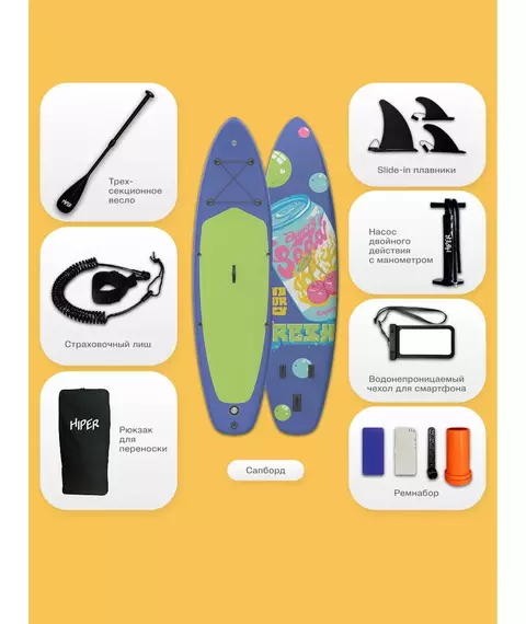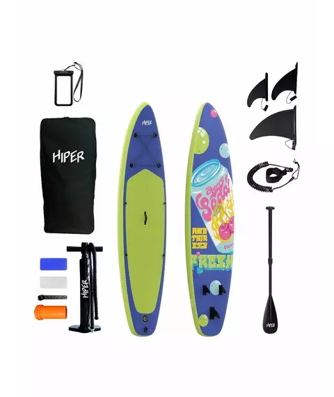 В комплект входит насос и весло, что делает доску готовой к использованию сразу после покупки. Насос обеспечивает удобство и скорость подготовки доски к использованию, а весло позволяет эффективно грести и управлять доской. Это делает HIPER SUPB-0144 идеальным выбором для активного отдыха на воде.