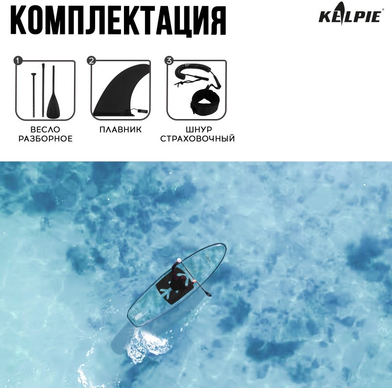 Прозрачная SUP-доска KELPIE предназначена для прогулок на спокойной воде и небольших волнах. Подходит для тренировок и отдыха спортсменов любого уровня подготовки.