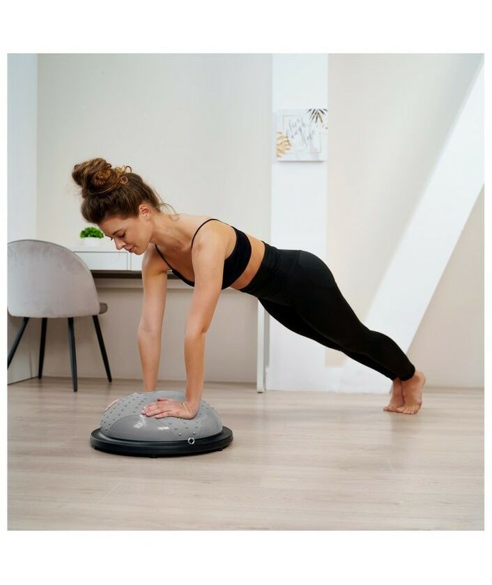 - Планка с притягиванием колена к груди. Полусферу нужно перевернуть плоской стороной вверх, затем встать в планку, обе руки на краю сферы с противоположных сторон. Как только получится удерживать равновесие, нужно притянуть колено одной ноги к груди по диагонали, а после сменить ногу.