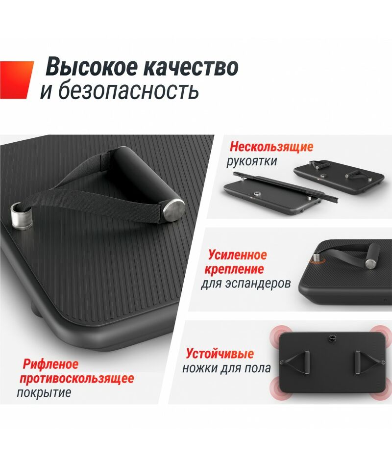 Вся конструкция силовой платформы продумана до мелочей. Обрезиненное покрытие ручек и составного грифа делает хват очень надежным, защищая от скольжения и предотвращая появление мозолей. Рифленое покрытие платформы не даст ногам соскользнуть, что обеспечит безопасность и устойчивость во время тренировок.
