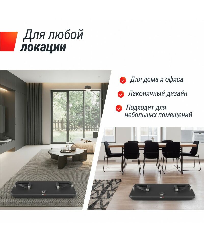 Тренажер оснащен транспортировочными роликами, благодаря им перемещение в пространстве не составит труда. Эргономичность конструкции позволит вписать платформу в любое помещение, а благодаря лаконичному дизайну, тренажер прекрасно дополнит интерьер. Бесшумная работа устройства позволит тренироваться даже в небольших помещениях, не вызывая неудобств.