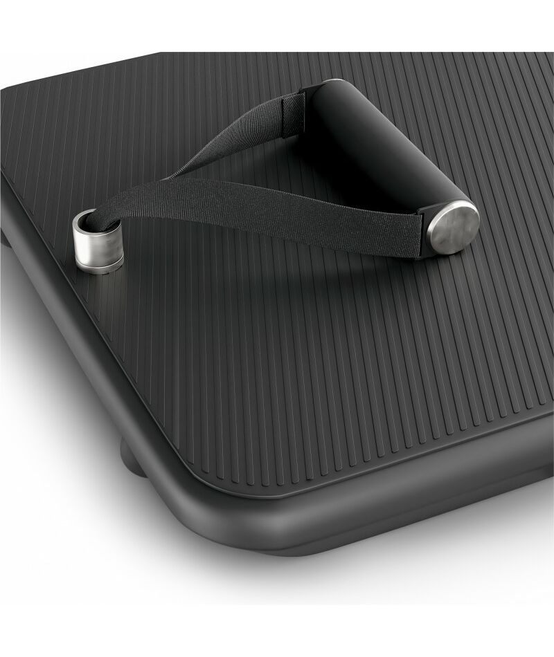 Платформа, обладая компактными размерами 70 x 40 x 5,8 см и весом 15 кг, построена на прочном каркасе из нержавеющей стали и алюминиевого сплава, что позволяет тренажеру выдерживать вес спортсмена до 120 кг, гарантируя конструкции стабильность и безопасность даже во время самых интенсивных тренировок.